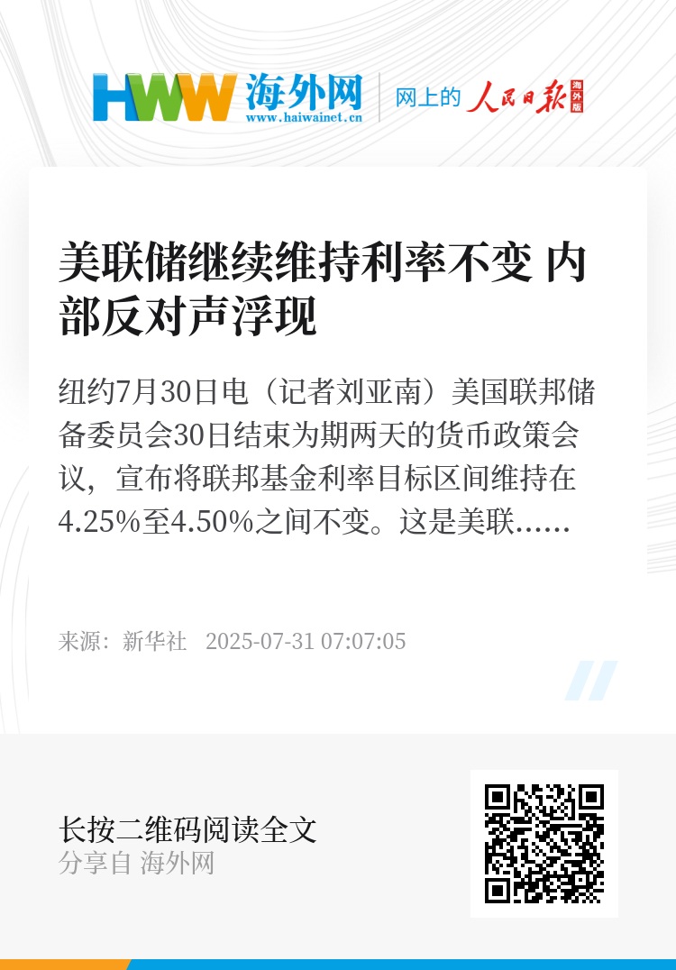 新华社纽约7月30日电(记者刘亚南)美国联邦储备委员会30日结束为期两天的货币政策会议,宣布将联邦基金利率目标区间维持在4.25%至4.50%之间不变。这是美联储货币政策会议连续第五次决定维持利率不变,符合市场预期。