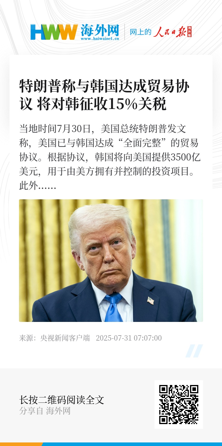 特朗普表示,美韩双方达成一致,美国将对韩国征收15%的关税。同时,美国不会被征收关税。韩国将对美全面开放贸易,接受包括汽车、卡车和农产品在内的美国产品。(央视记者 刘骁骞)