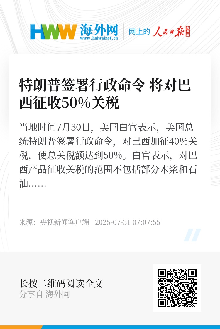 当地时间7月30日,美国白宫表示,美国总统特朗普签署行政命令,对巴西加征40%关税,使总关税额达到50%。