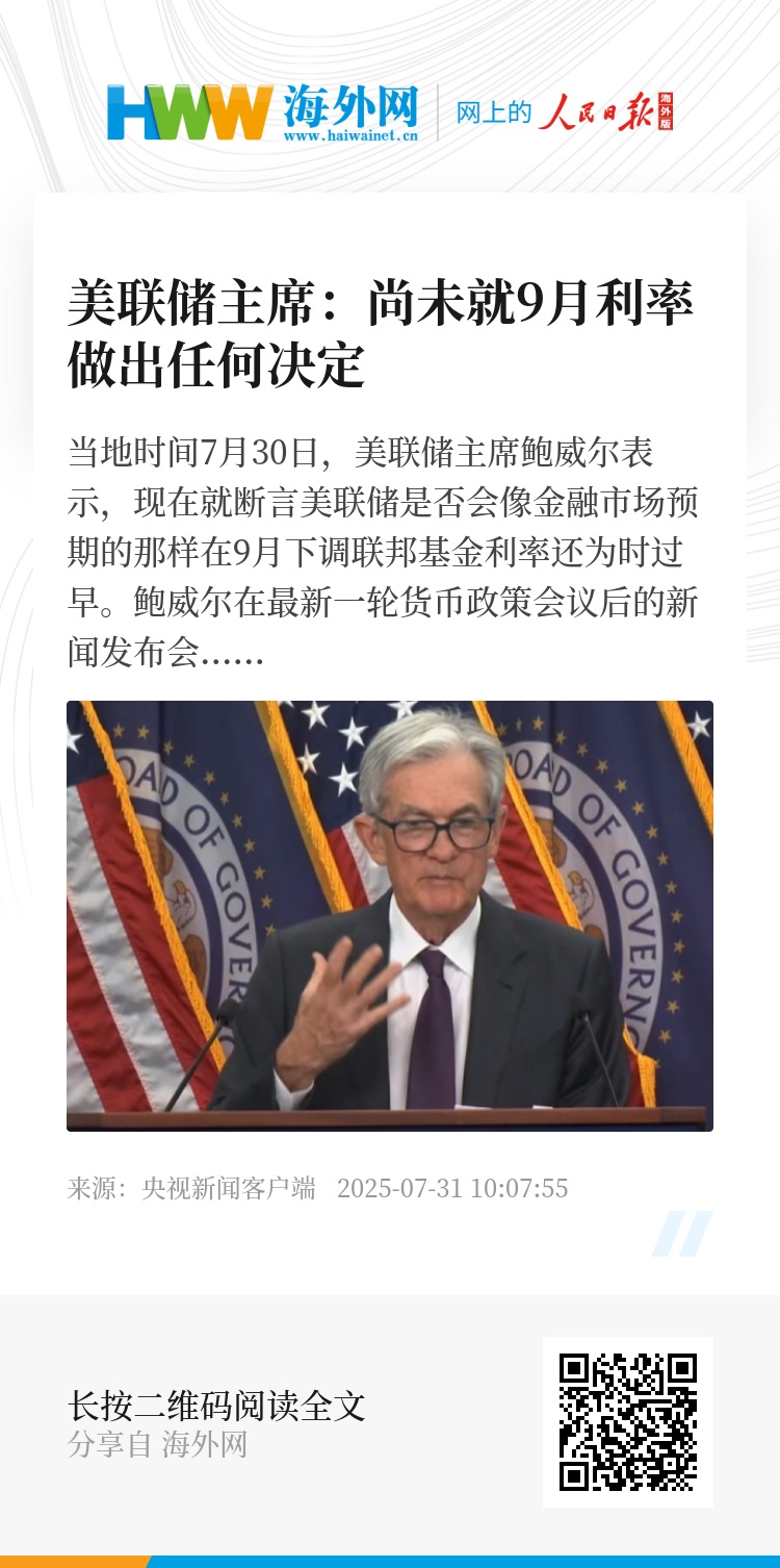 鲍威尔在最新一轮货币政策会议后的新闻发布会上表示,美联储尚未就9月利率做出任何决定。鲍威尔表示,他们“将在下次议息会议前夕参考有关经济的信息”。