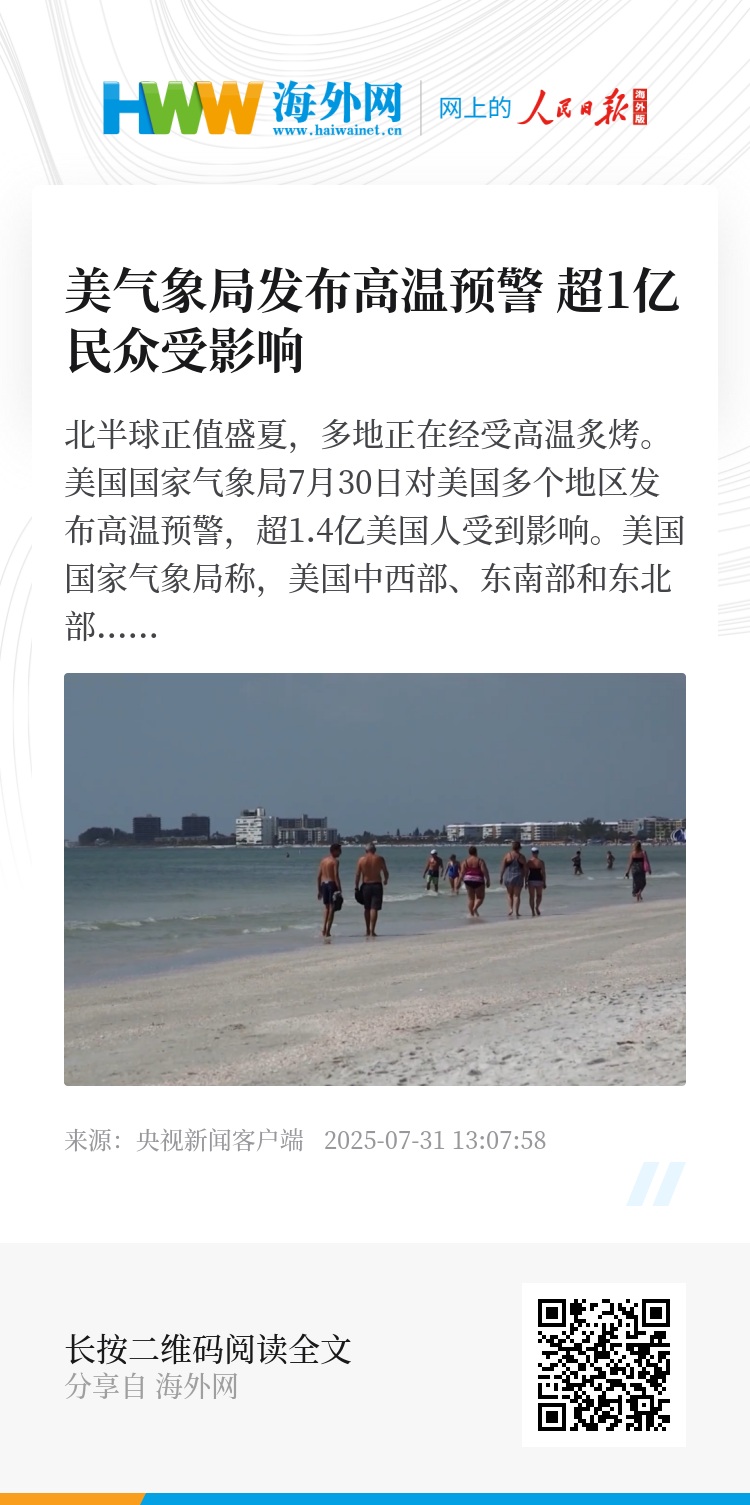 北半球正值盛夏,多地正在经受高温炙烤。美国国家气象局7月30日对美国多个地区发布高温预警,超1.4亿美国人受到影响。