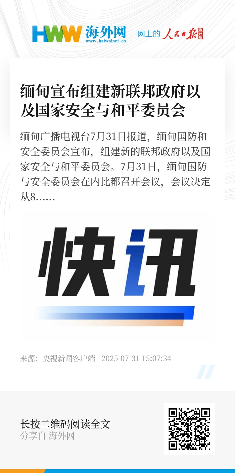 缅甸广播电视台7月31日报道,缅甸国防和安全委员会宣布,组建新的联邦政府以及国家安全与和平委员会。