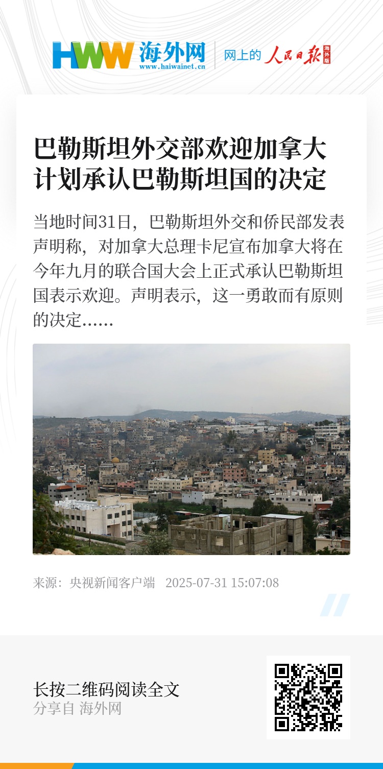当地时间31日,巴勒斯坦外交和侨民部发表声明称,对加拿大总理卡尼宣布加拿大将在今年九月的联合国大会上正式承认巴勒斯坦国表示欢迎。