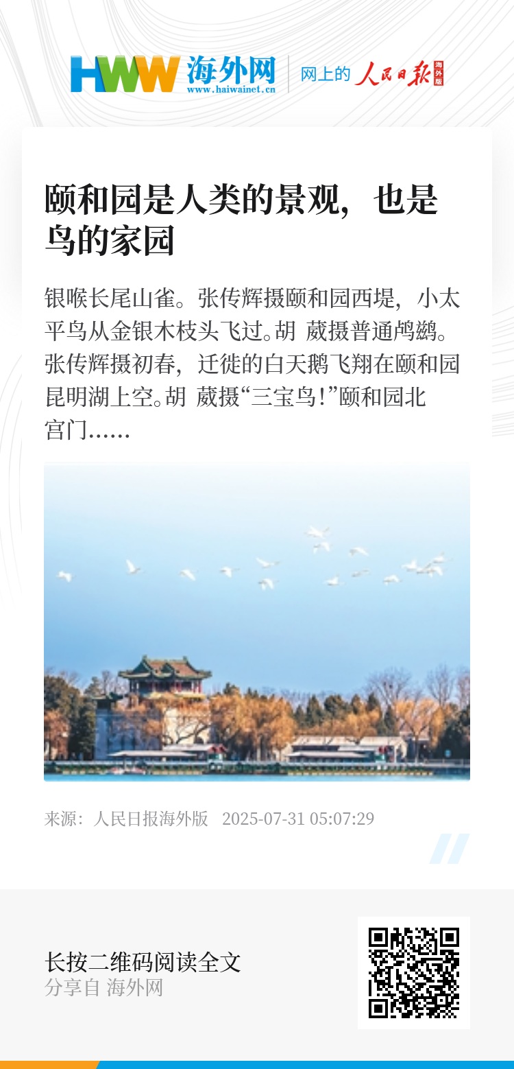 如今,颐和园里有记录的野生鸟类多达147种。在多方共同努力呵护下,颐和园已经成为诸多鸟类青睐的栖息地。每天,从北京甚至全国各地而来的游客们,与鸟类共同徜徉在这片曾经的皇家园林。
