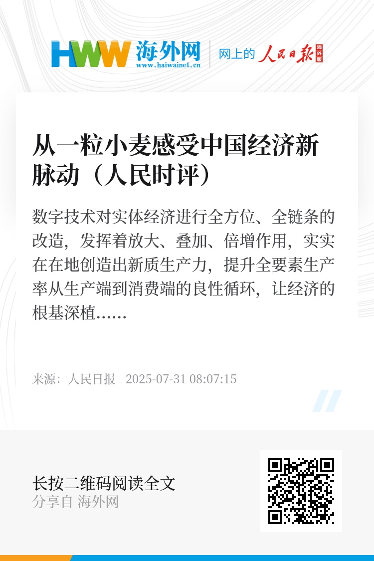 沉甸甸的夏粮答卷,意义已远超一季收成。从一粒小麦,人们看见了精准治理升级、数实融合引擎和全链循环生态,触摸到了更具韧性、更高效率、更富活力的经济基本盘。手中有粮,心中不慌。这份来自田野的底气,将助力中国经济巨轮在新航程中破浪前行。(常钦)