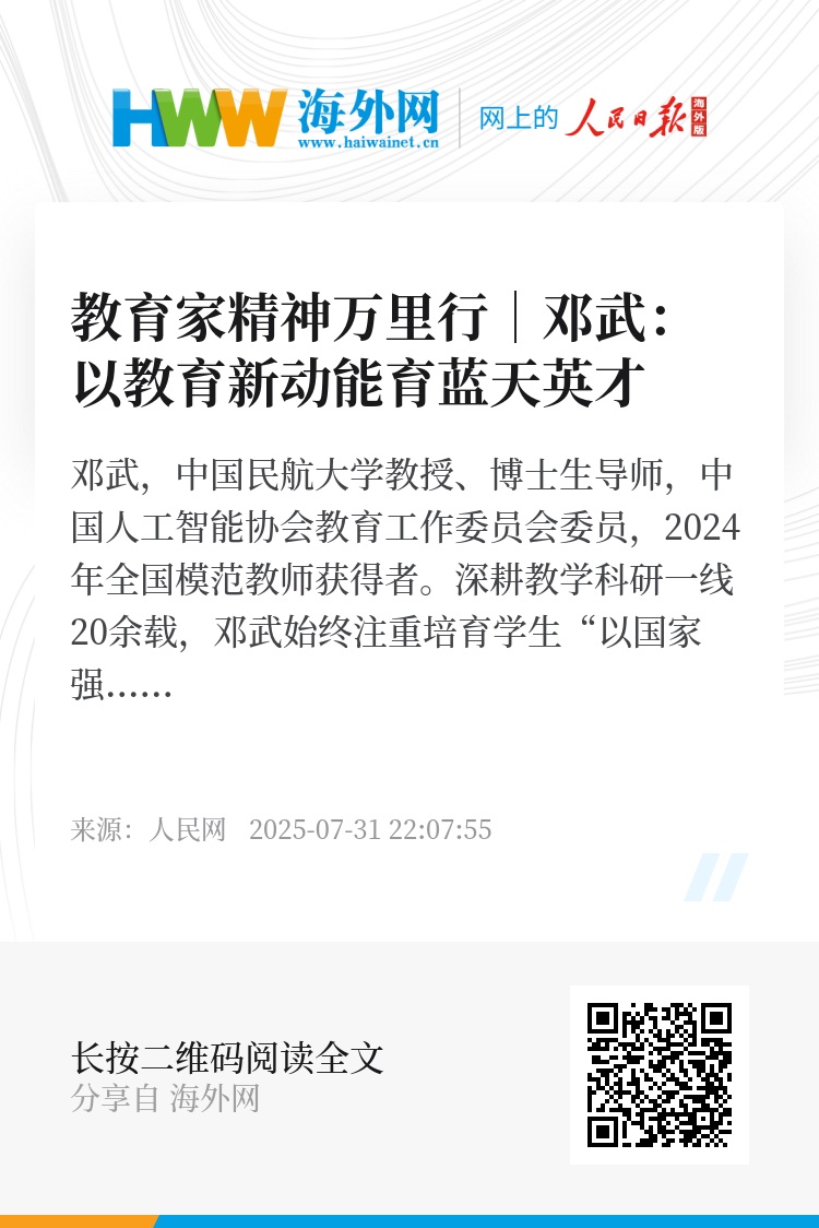 邓武,中国民航大学教授、博士生导师,中国人工智能协会教育工作委员会委员,2024年全国模范教师获得者。