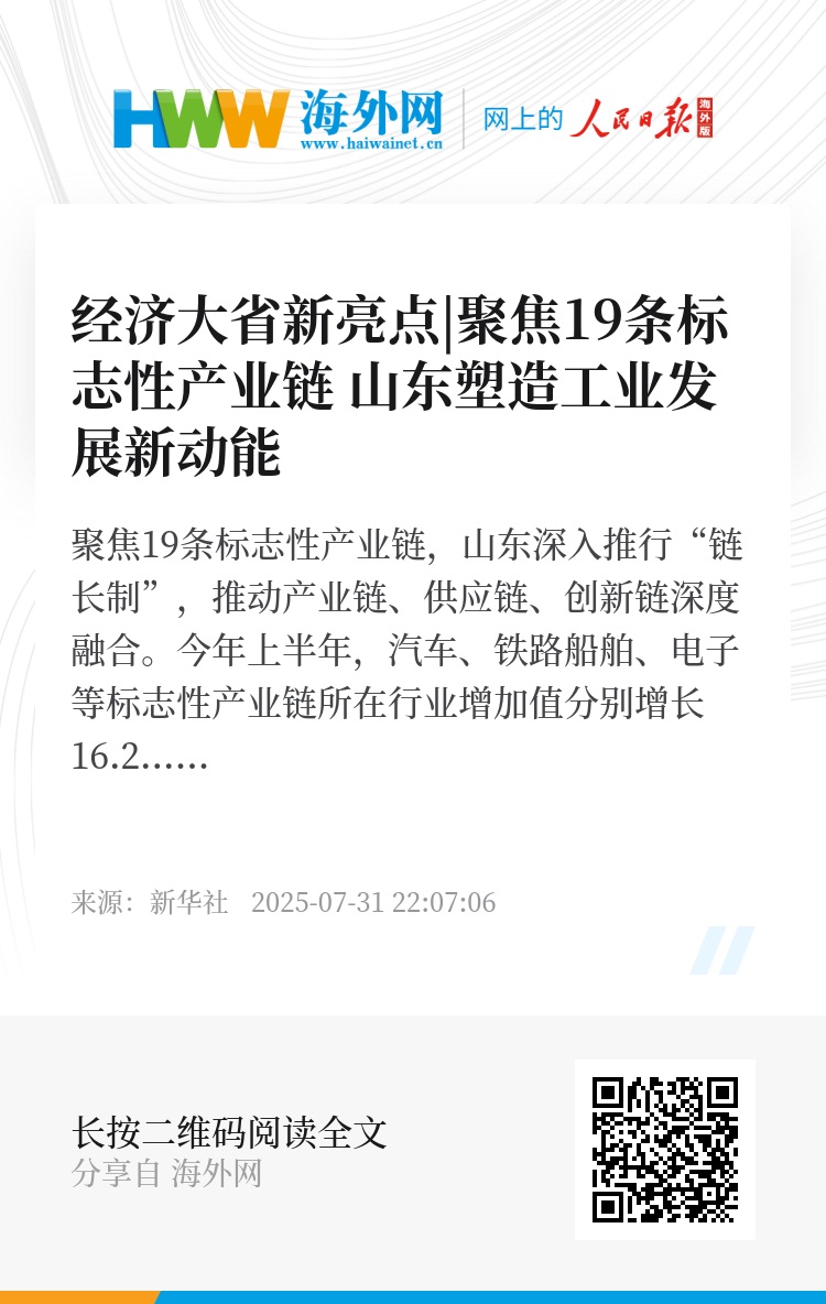 据山东省工业和信息化厅副厅长王茂庆介绍,19条标志性产业链涵盖人工智能、新能源装备、现代医药、纺织服装等领域。入链企业数量超3.6万家,占全省的90%以上。