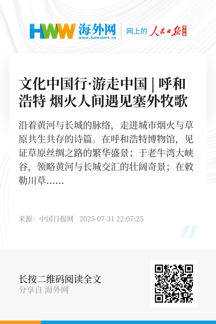 沿着黄河与长城的脉络,走进城市烟火与草原共生共存的诗篇。在呼和浩特博物馆,见证草原丝绸之路的繁华盛景;于老牛湾大峡谷,领略黄河与长城交汇的壮阔奇景;在敕勒川草原,感受“天似穹庐”的辽阔诗意。吃上一笼热气腾腾的烧麦,品味地道的老城烟火;穿梭于牛街、宽巷子,解锁冰煮羊等特色美食。跟随中国日报游走中国体验官特洛伊,走进呼和浩特这座“青城”,感受它独一无二的多元魅力吧!