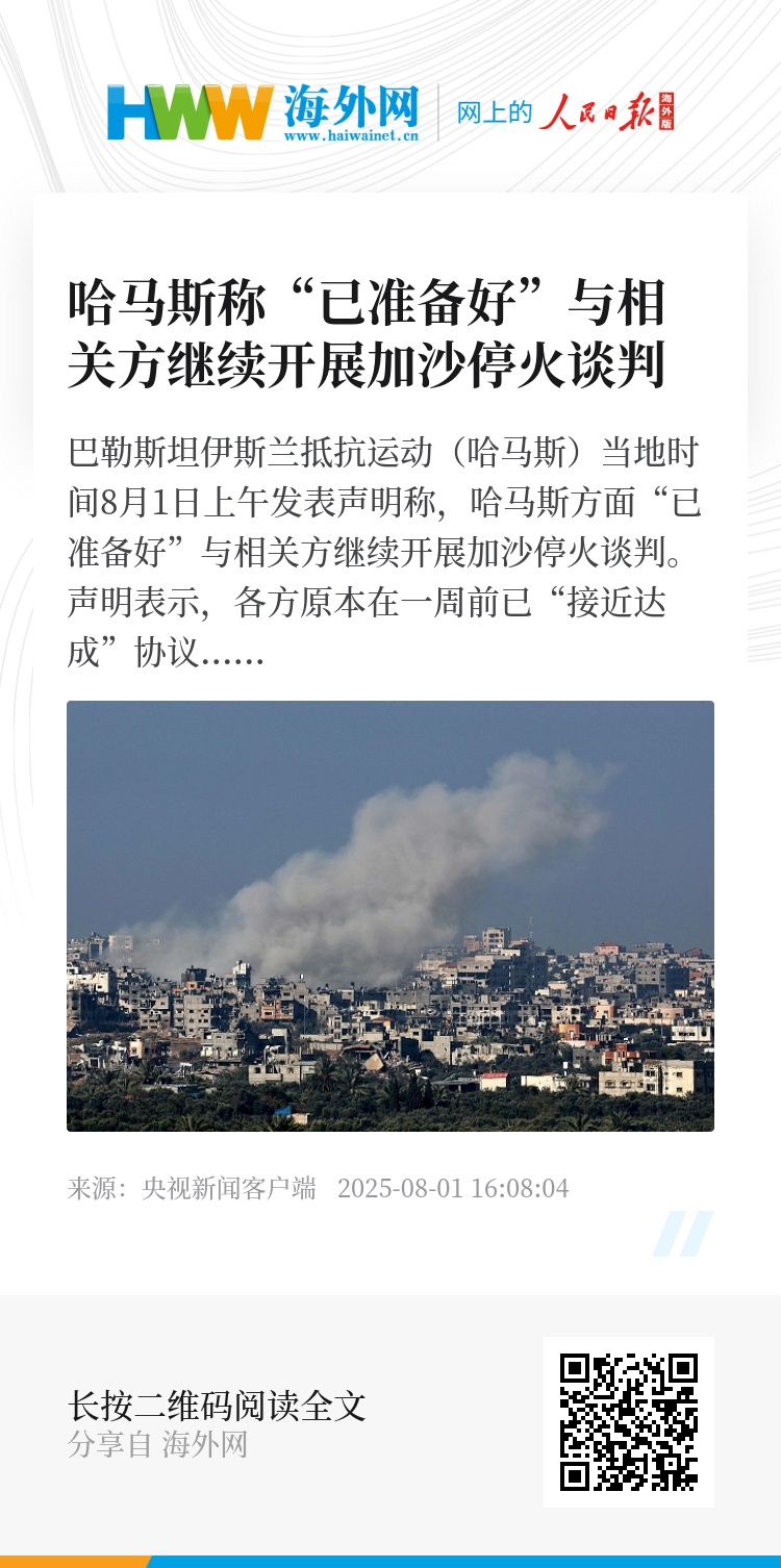 巴勒斯坦伊斯兰抵抗运动(哈马斯)当地时间8月1日上午发表声明称,哈马斯方面“已准备好”与相关方继续开展加沙停火谈判。