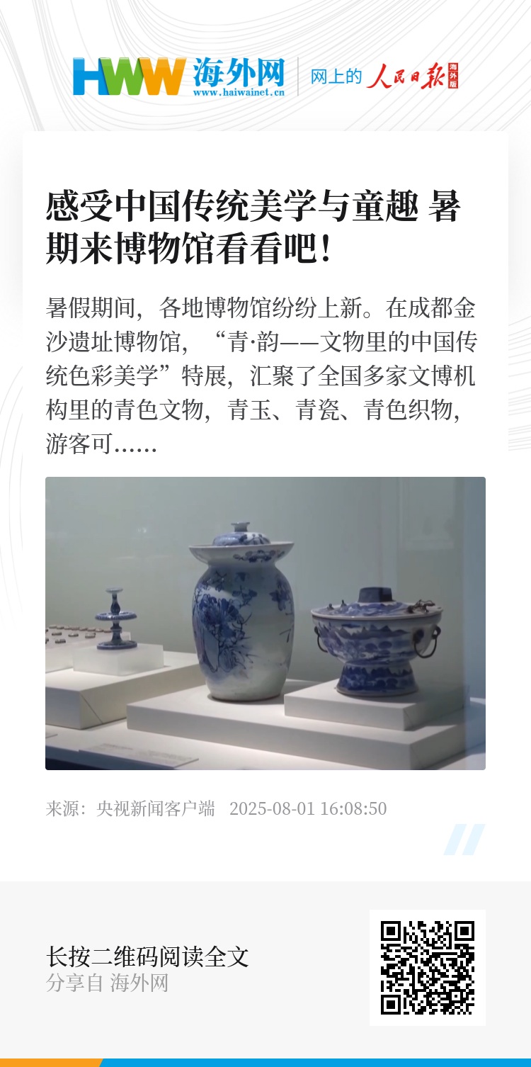 暑假期间,各地博物馆纷纷上新。在成都金沙遗址博物馆,“青·韵——文物里的中国传统色彩美学”特展,汇聚了全国多家文博机构里的青色文物,青玉、青瓷、青色织物,游客可沉浸式感受中国传统色彩美学的魅力。