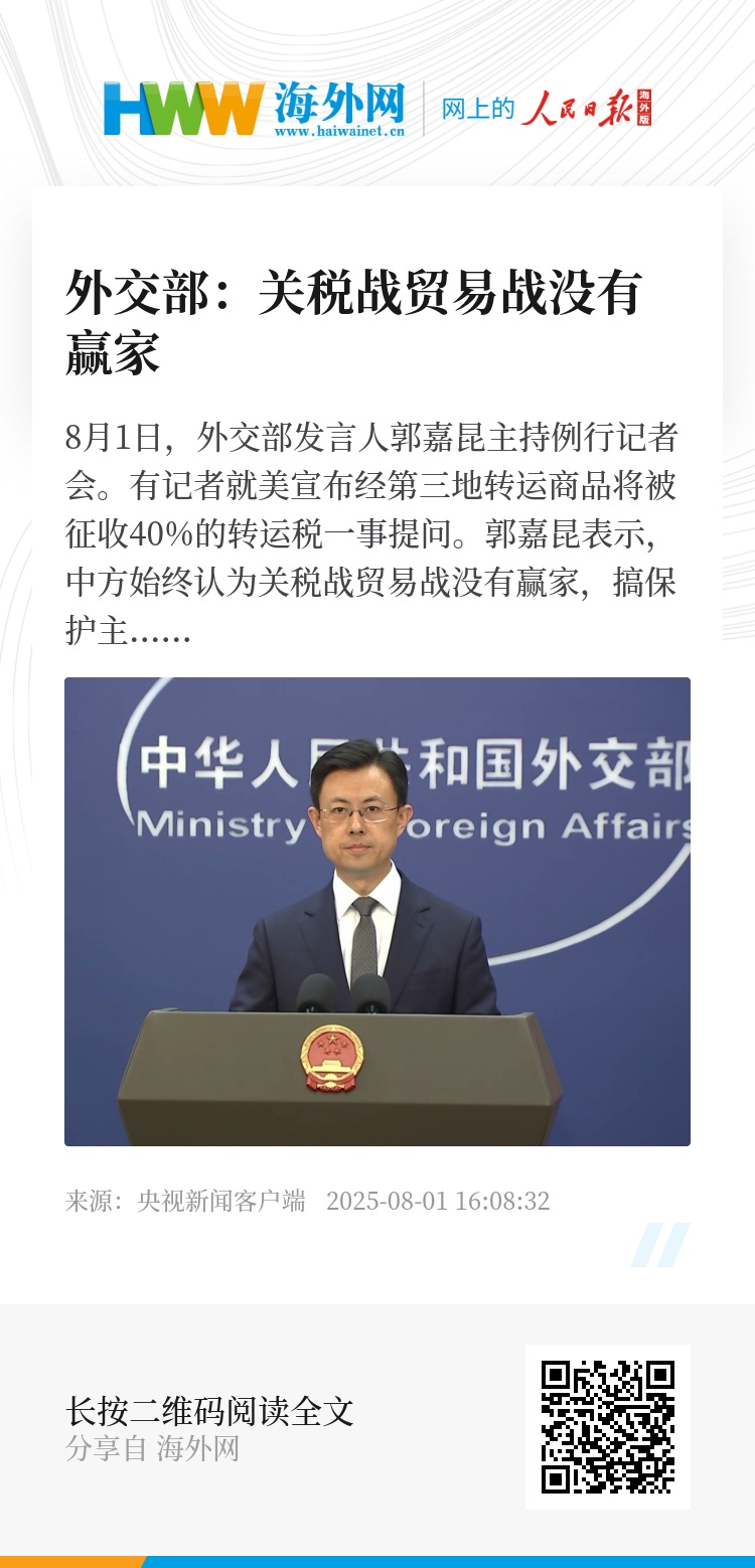 8月1日,外交部发言人郭嘉昆主持例行记者会。有记者就美宣布经第三地转运商品将被征收40%的转运税一事提问。