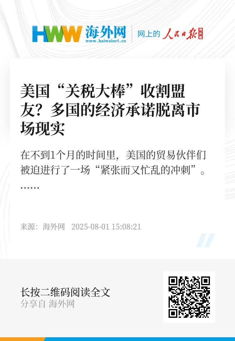美国和盟友之间的不平衡协议迅速引发舆论反弹,从欧洲到东亚,用投资和市场换取的关税协议被打上“投降”“挨宰”等标签,“我们真的是盟友吗”等质疑声甚嚣尘上。