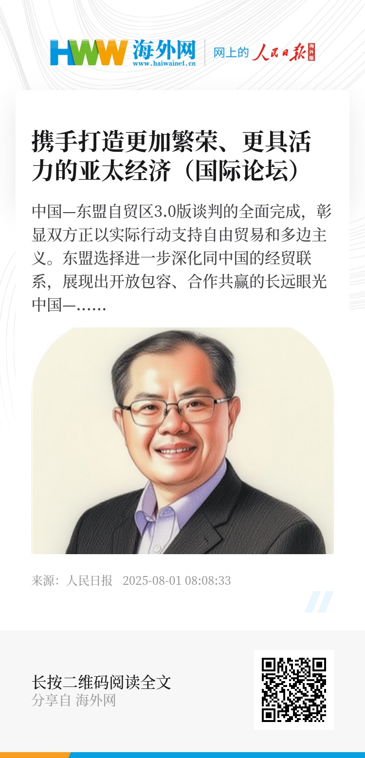 当前,全球地缘政治和国际贸易格局正面临重大变化。中国—东盟自贸区3.0版谈判的全面完成,彰显双方正以实际行动支持自由贸易和多边主义。正如新加坡总理黄循财所说,升级自由贸易协定是一个重要举措,特别是在全球保护主义日益抬头的背景下,这一举措将向全世界发出一个明确且重要的信号,那就是自由贸易和互惠的市场合作至关重要。