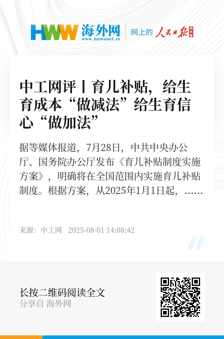 公平、普惠、可持续的育儿补贴制度,是迈向生育友好型社会的重要一步。面向未来,期待能有更多精细、温暖的政策举措回应公众多元化的生育需求,以生育成本的“减法”换来生育信心的“加法”,为提高生育水平、促进人口高质量发展提供有力支撑。(中工网评论员 张雪)