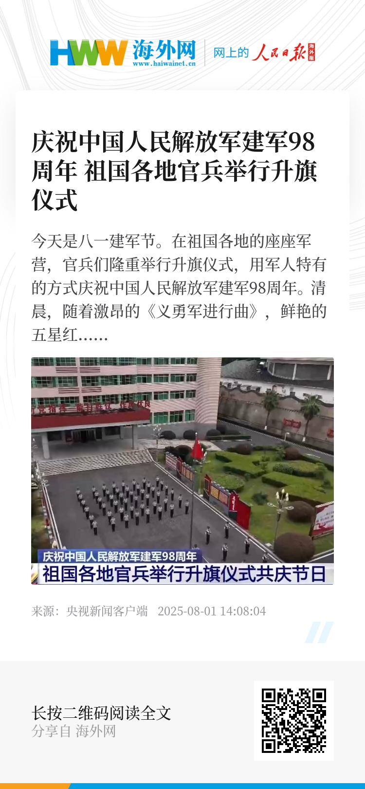 今天是八一建军节。在祖国各地的座座军营,官兵们隆重举行升旗仪式,用军人特有的方式庆祝中国人民解放军建军98周年。