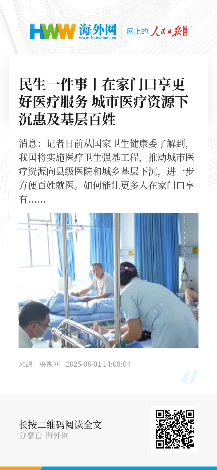 央视网消息:记者日前从国家卫生健康委了解到,我国将实施医疗卫生强基工程,推动城市医疗资源向县级医院和城乡基层下沉,进一步方便百姓就医。如何能让更多人在家门口享有更好的医疗服务?民生一件事,集中关注。