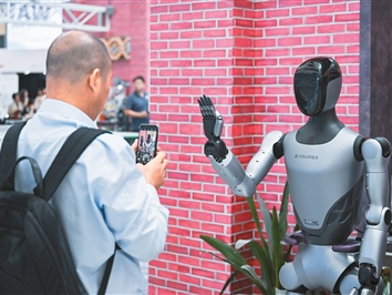 近日,在二〇二五世界人工智能大会展览现场,参观者和一款人形机器人互动。新华社记者 陈浩明摄