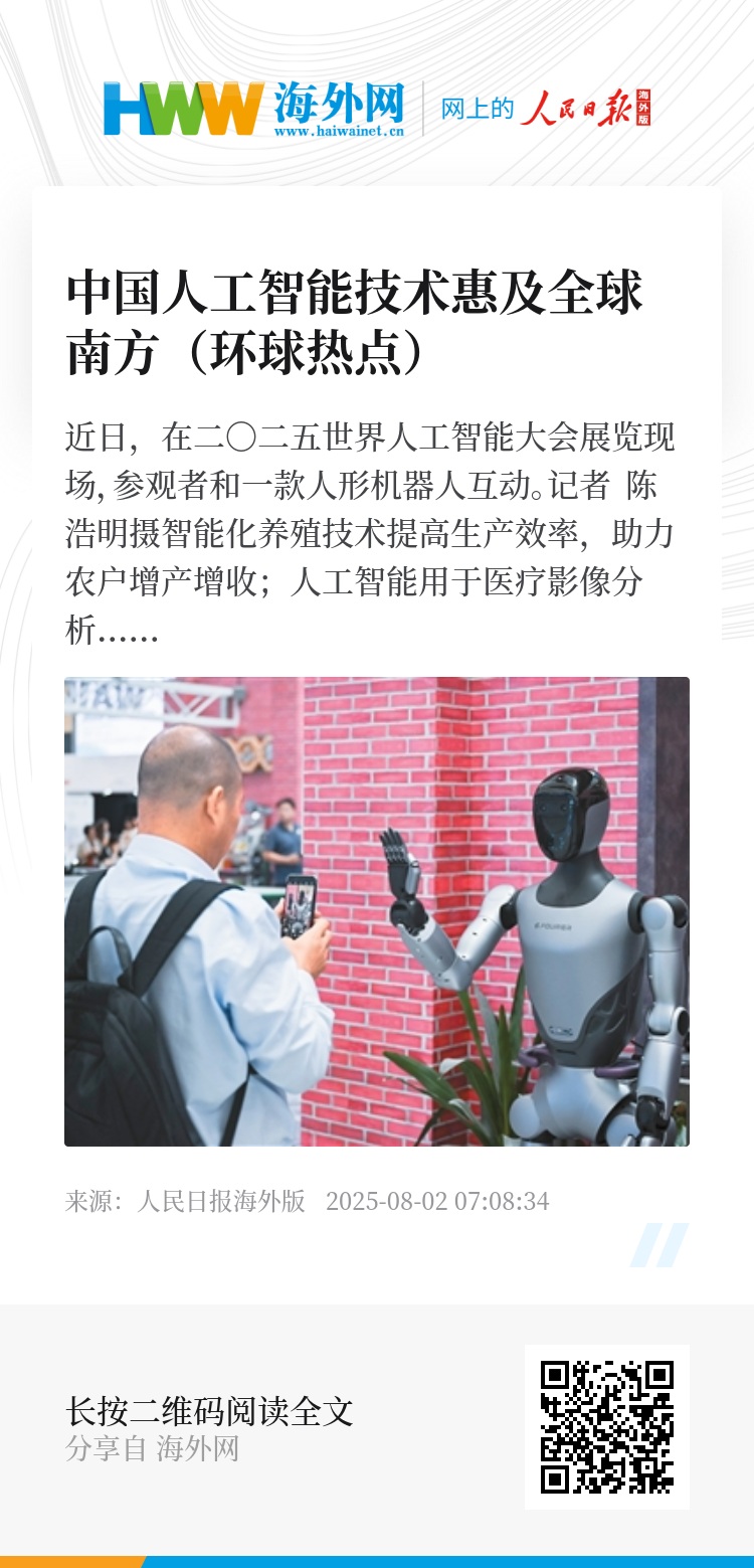 翻开《中国智·惠世界(2025)》案例集,这样的鲜活故事比比皆是。中国人工智能技术助力巴西电网、泰国矿区等实现高效运转和作业;基于中国人工智能大模型的多语种互译系统,在缅甸地震灾区为生命“接力”;人工智能赋能教育跨越国界,让文化传承触手可及……在智慧城市、医疗健康、农业发展、文化交流等十多个领域,中国人工智能技术以多元场景应用,回应着世界对美好生活的向往。