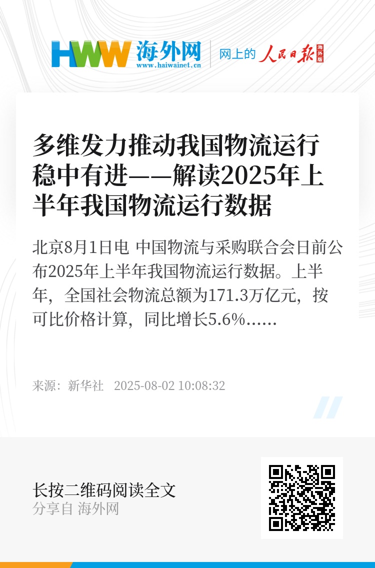 新华社北京8月1日电 中国物流与采购联合会日前公布2025年上半年我国物流运行数据。上半年,全国社会物流总额为171.3万亿元,按可比价格计算,同比增长5.6%。