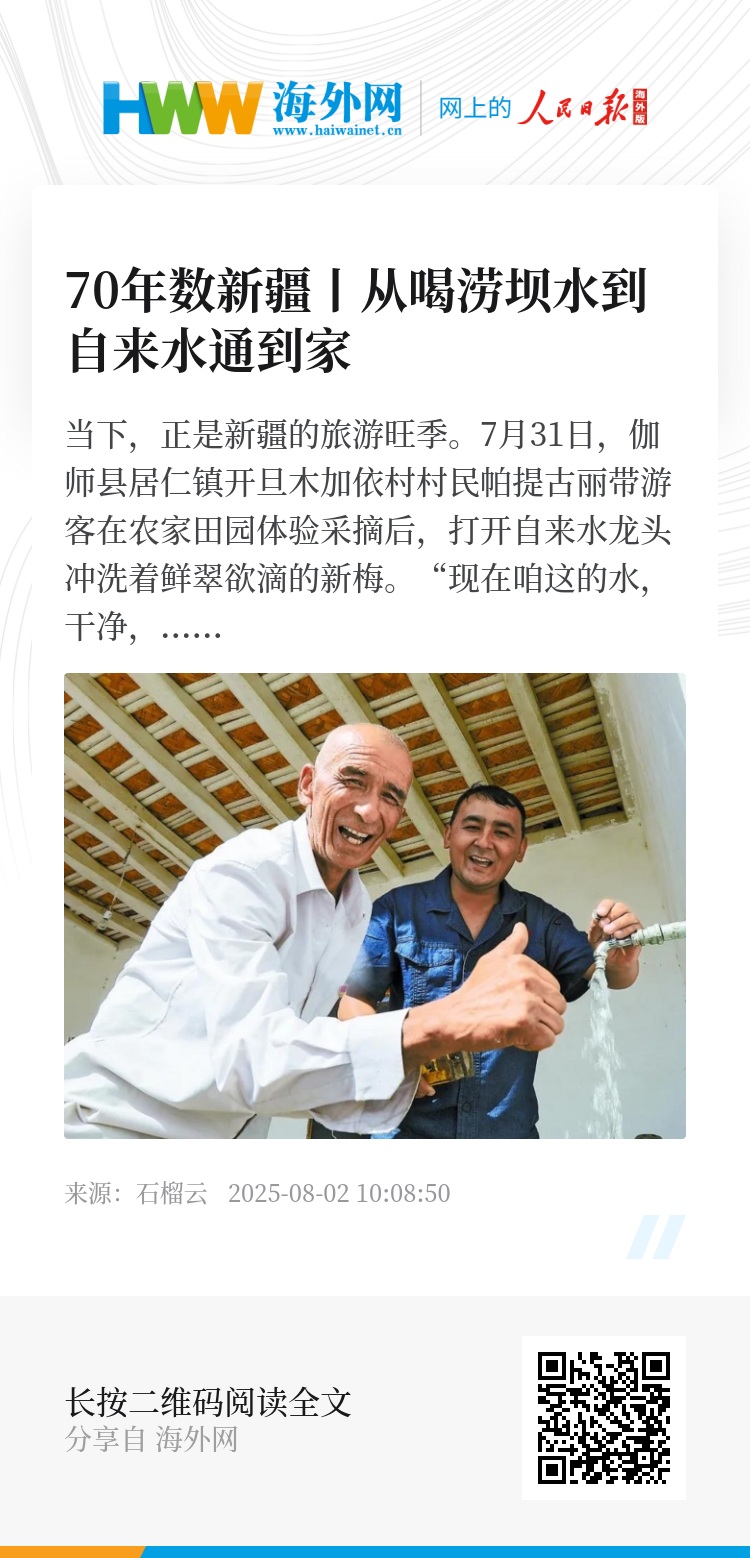 2024年,开旦木加依村入选自治区乡村旅游重点村,年接待游客量高达14.4万人次,旅游收入近1000万元。帕提古丽和很多村民一样,没有亲眼见过盖孜河上游那片清澈水池,但他们喝着甘甜自来水时,会给孩子们讲祖辈喝涝坝水的故事,讲水利英雄刘虎用生命点亮“引雪水进伽师”的梦想;看着清泉灌溉农田时,会庆祝伽师瓜、伽师杏、新梅的连年丰收,也会感慨家乡千亩杏树林和民宿集群迎来送往的繁华。(石榴云/新疆日报记者 康颢严)
