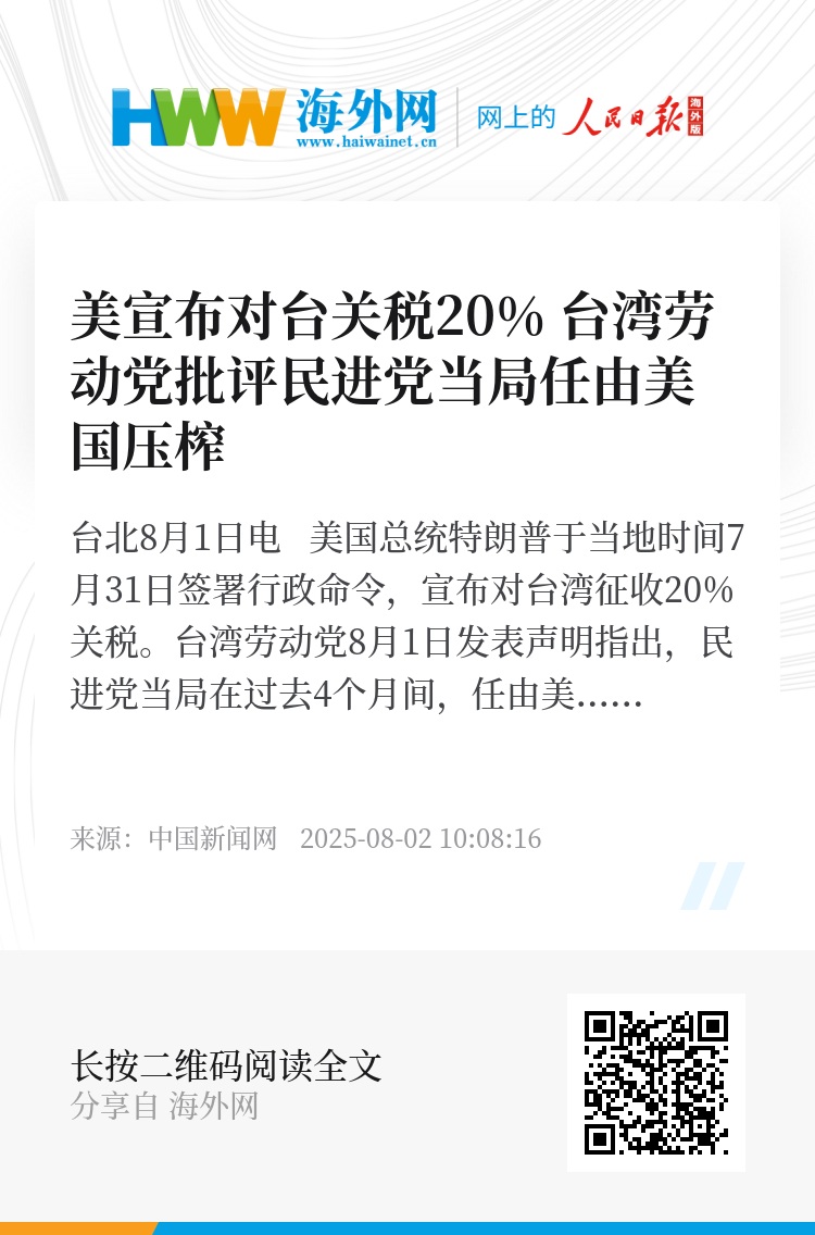 中新网台北8月1日电 美国总统特朗普于当地时间7月31日签署行政命令,宣布对台湾征收20%关税。台湾劳动党8月1日发表声明指出,民进党当局在过去4个月间,任由美国借关税议题不断进行压榨,一味牺牲岛内经济产业和社会发展的自主性,给台湾带来危机。