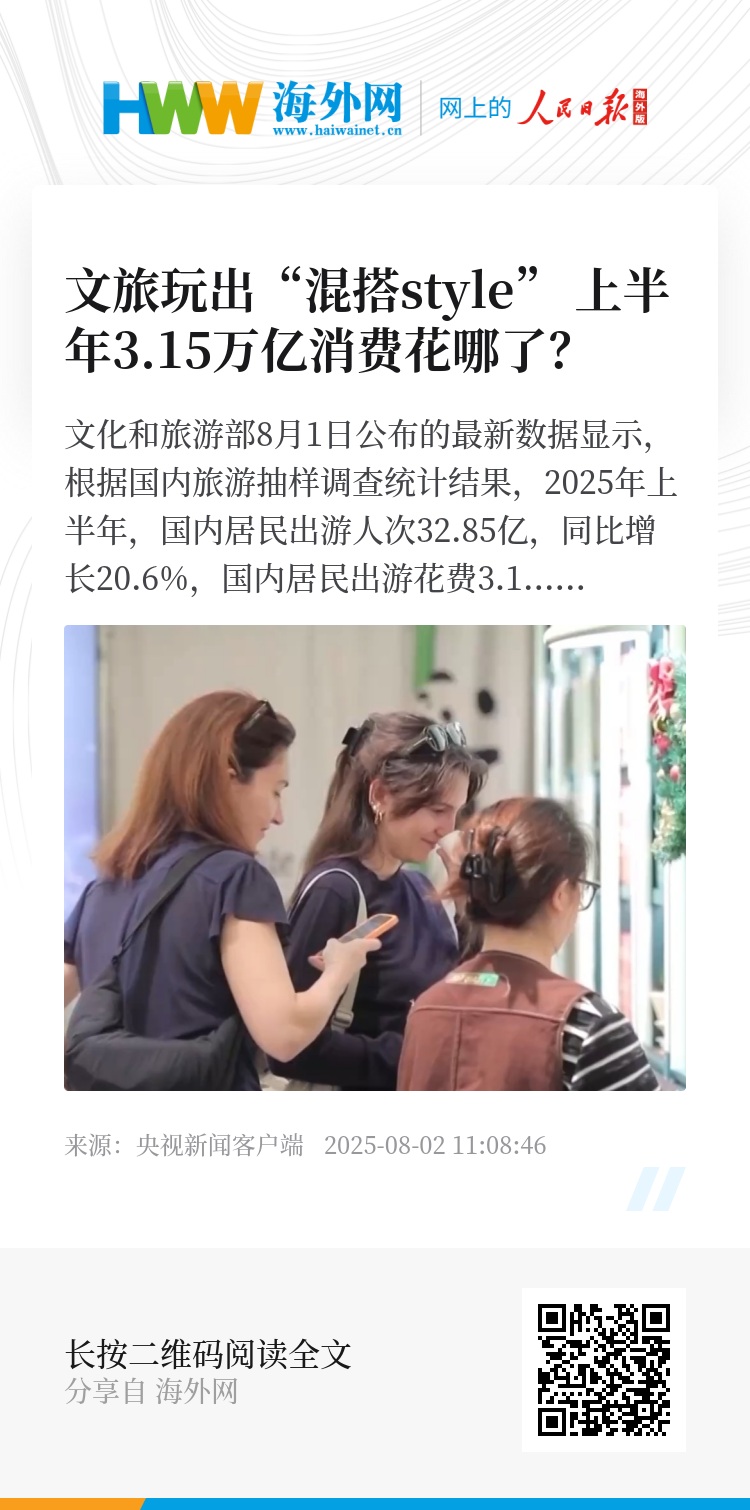文化和旅游部8月1日公布的最新数据显示,根据国内旅游抽样调查统计结果,2025年上半年,国内居民出游人次32.85亿,同比增长20.6%,国内居民出游花费3.15万亿元,同比增长15.2%。今年上半年,旅游市场供需两端发力,各地打造消费新场景,展现文旅消费市场活力。