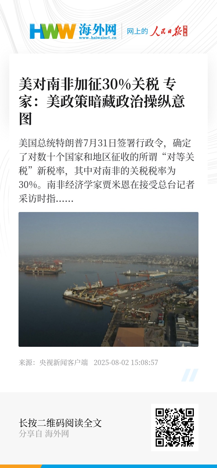 美国总统特朗普7月31日签署行政令,确定了对数十个国家和地区征收的所谓“对等关税”新税率,其中对南非的关税税率为30%。南非经济学家贾米恩在接受总台记者采访时指出,美国所谓的“对等关税”政策背后隐藏着明显的政治操控意图——凡是外交立场不“顺从”的国家,都可能成为美国贸易霸权的打击对象。