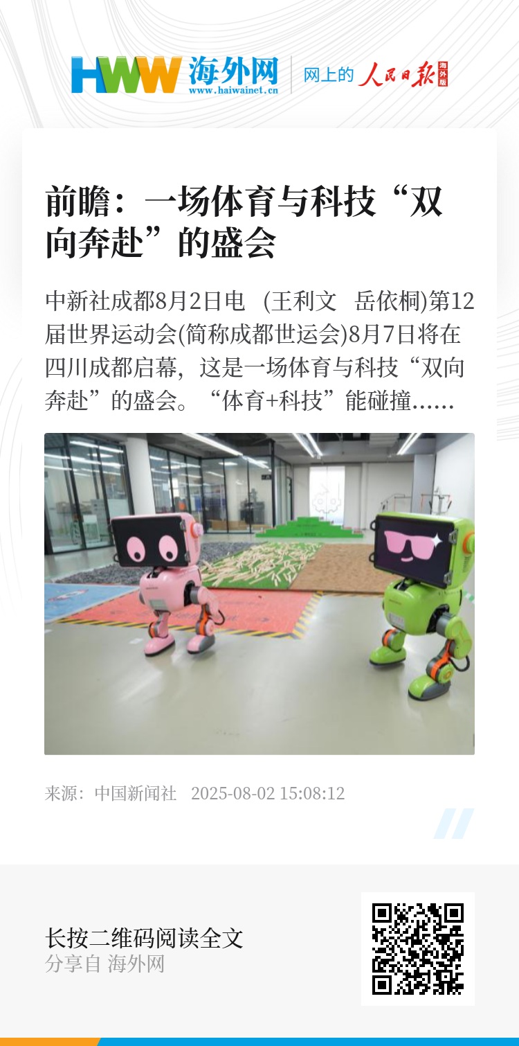 中新社成都8月2日电 (王利文 岳依桐)第12届世界运动会(简称成都世运会)8月7日将在四川成都启幕,这是一场体育与科技“双向奔赴”的盛会。