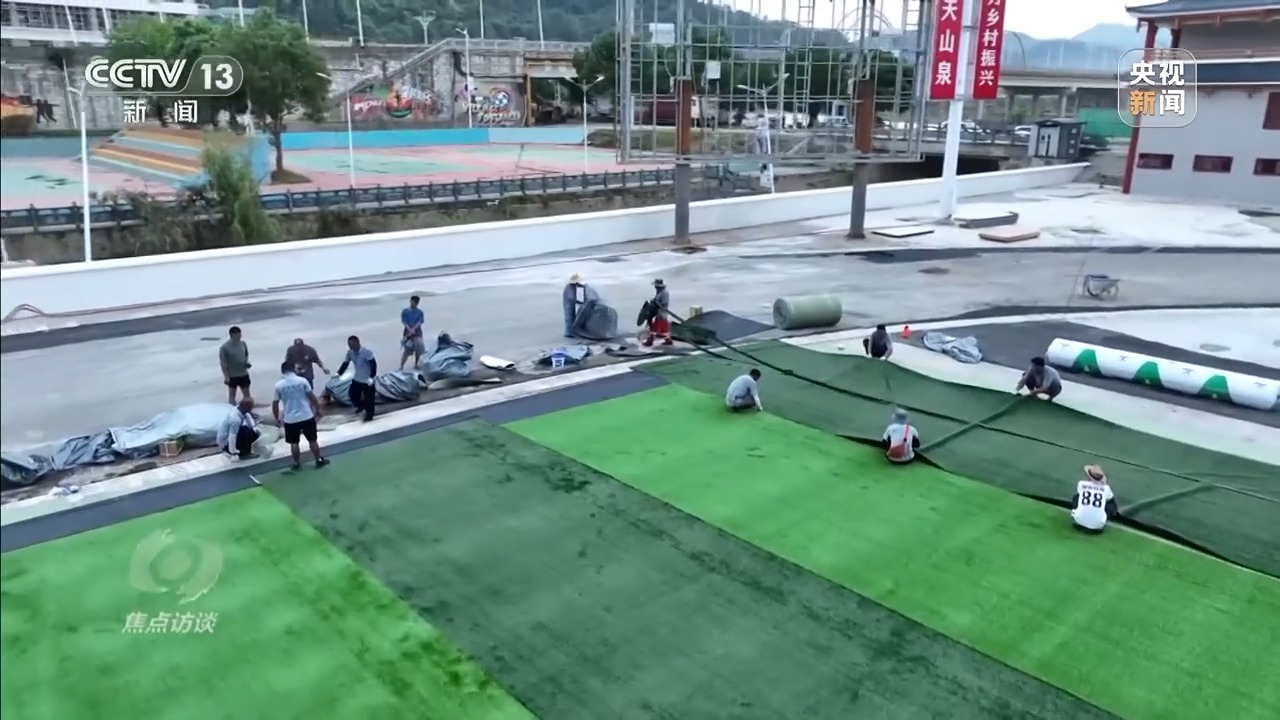 不仅有许多外地的设备来支援,也有很多来自全国各地的救援队伍一起参与到建设中。经过数天的努力,全县艰难的清淤工作终于完成,球场进入重建阶段。