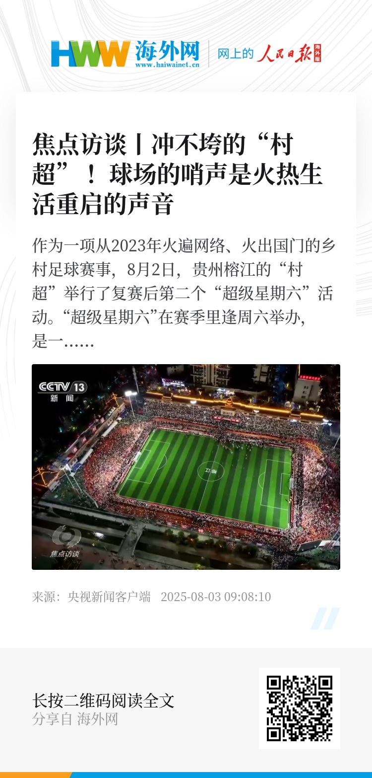 记者在榕江采访的时候,深刻感受到“村超”在榕江百姓心目中的位置。对榕江人来说,“村超”是名片,是经济,是希望,也是精神的象征。为了让“村超”尽快重新开赛,当地干部群众携手外地的援建队伍,争分夺秒进行灾后重建,很多榕江百姓也都自发到球场,给施工人员送去绿豆汤和西瓜,帮助他们消暑。经历洪水的“村超”,让我们看到的是榕江人面对困难迸发出来的团结、乐观和拼劲儿;也让我们看到,生活里总是会有这样那样的艰难时刻,但是就像村超的赛场,只要携手去拼,就有希望。