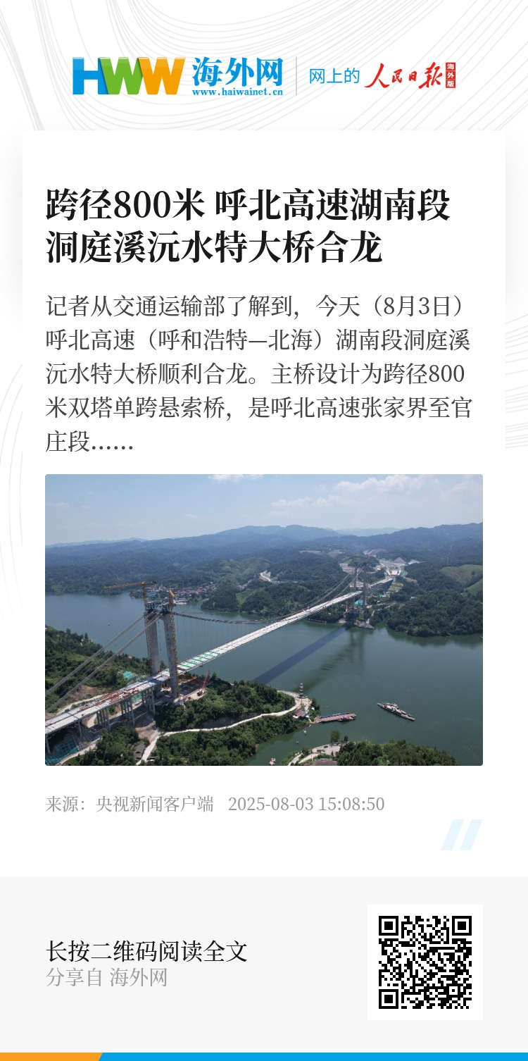 记者从交通运输部了解到,今天(8月3日)呼北高速(呼和浩特—北海)湖南段洞庭溪沅水特大桥顺利合龙。