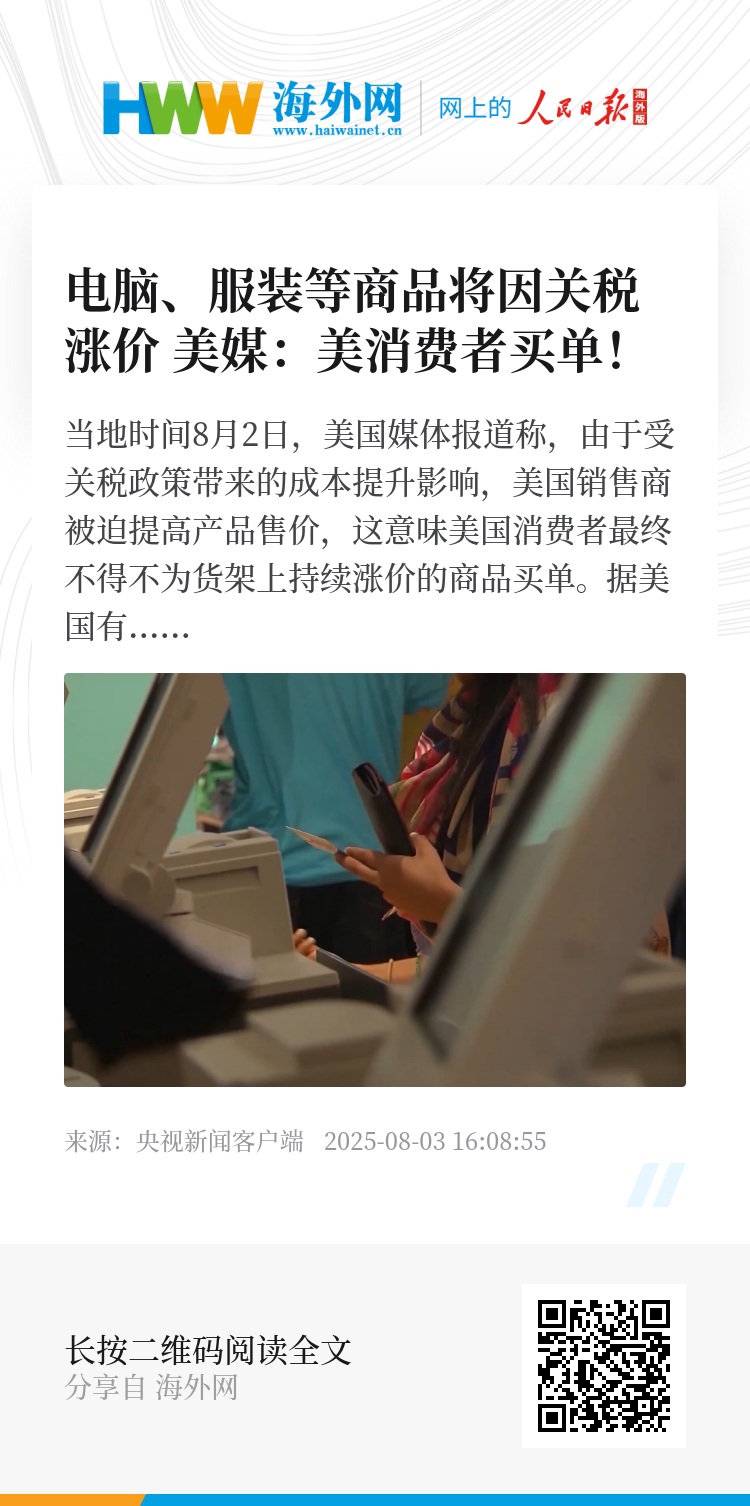 当地时间8月2日,美国媒体报道称,由于受关税政策带来的成本提升影响,美国销售商被迫提高产品售价,这意味美国消费者最终不得不为货架上持续涨价的商品买单。
