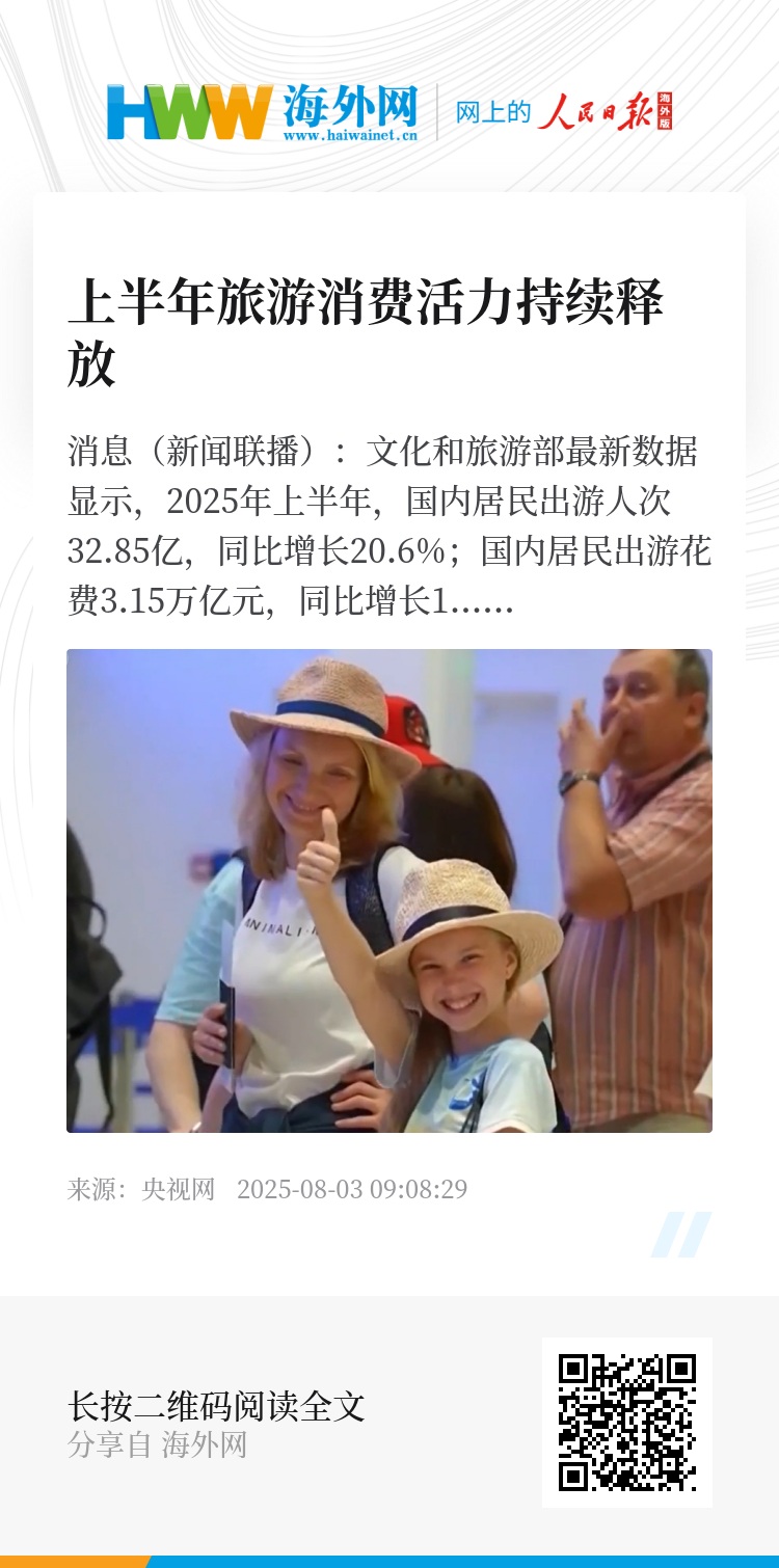 央视网消息(新闻联播):文化和旅游部最新数据显示,2025年上半年,国内居民出游人次32.85亿,同比增长20.6%;国内居民出游花费3.15万亿元,同比增长15.2%。