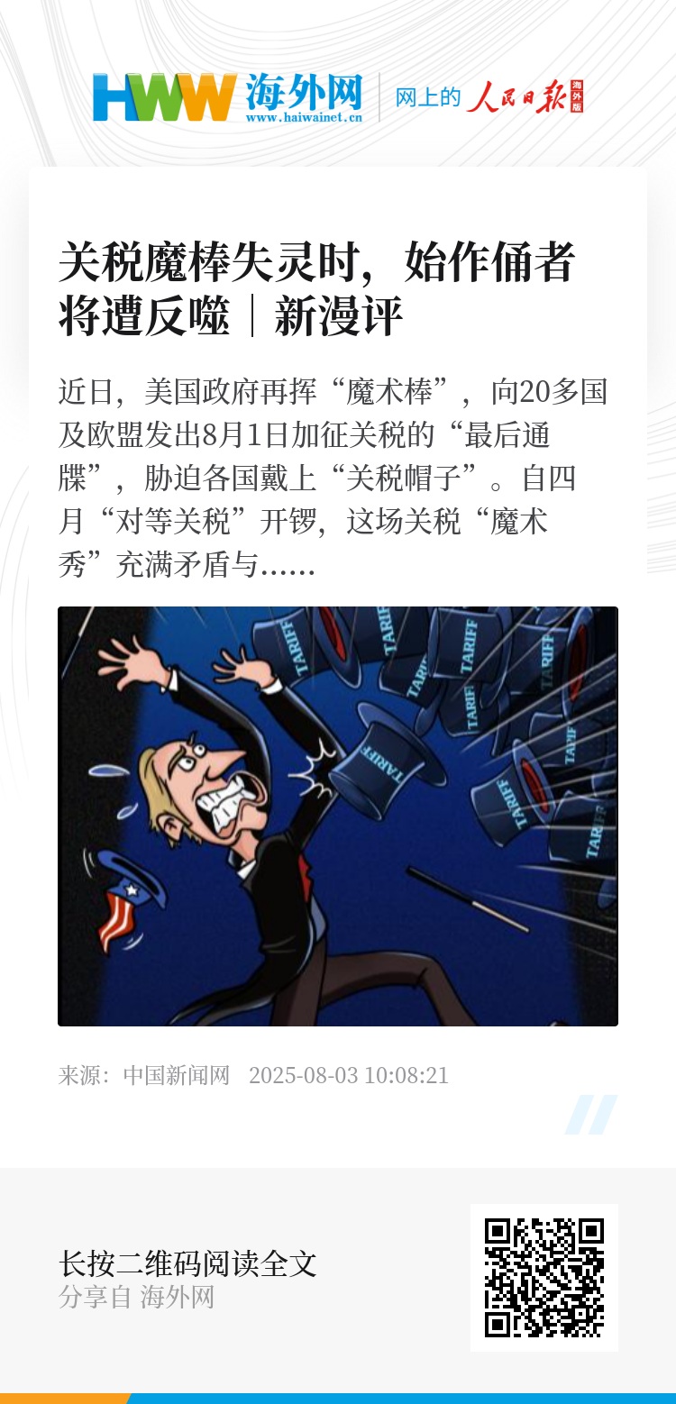 近日,美国政府再挥“魔术棒”,向20多国及欧盟发出8月1日加征关税的“最后通牒”,胁迫各国戴上“关税帽子”。自四月“对等关税”开锣,这场关税“魔术秀”充满矛盾与荒诞,主演者的反复无常已成唯一“定式”。