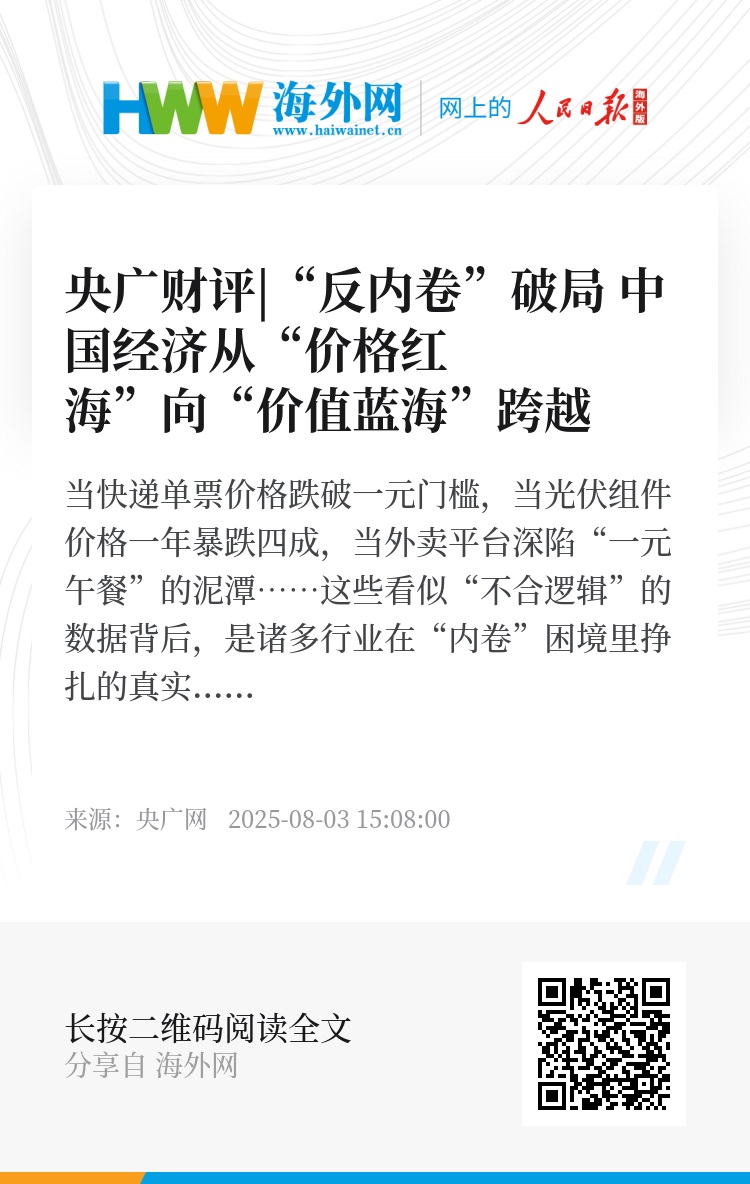 市场需要的从来不只是低价,而是创新、品质与效率。随着中国经济迈向高质量发展,从“以价换量”转向“品质提升”已成为各行业的必经之路。从形成共识,到执行落地,“内卷”的治理工作正逐渐纵深。接下来,要推动相关法律法规尽快完善,筑牢防线;监管部门和行业协会要加强管理和自律引导,综合整治无序竞争行为,引导企业科学定价、理性竞争;企业自身要以长远发展为计,尤其是龙头企业要带头行动,抵制恶性竞争,以高度的责任感推动市场环境回归健康发展轨道。在多方努力下,相关领域定能实现从“价格红海”到“价值蓝海”的跨越,进入高质量发展的正途。(央广财经评论员万玉航)