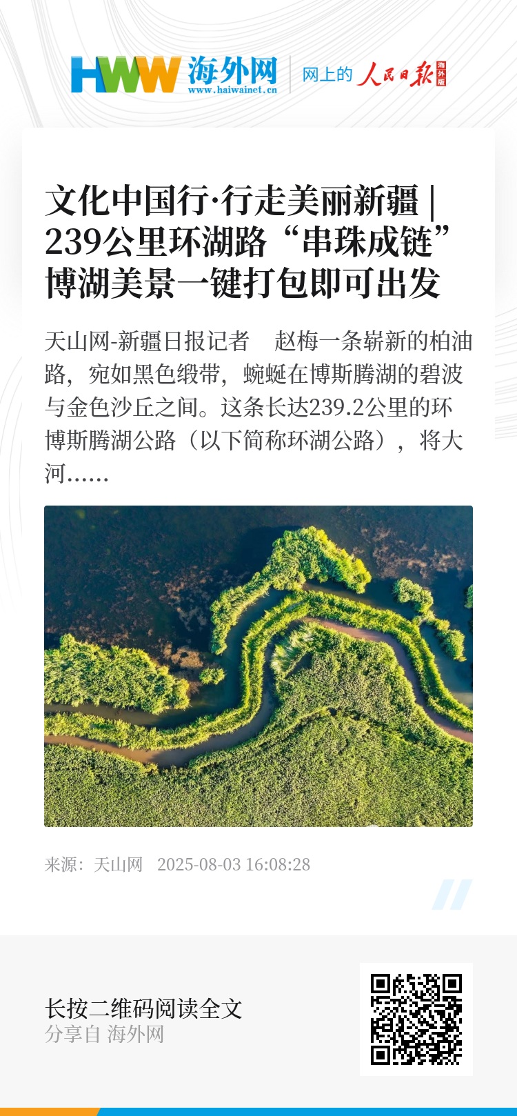 行驶在环湖公路,领略的是大漠平湖的雄浑与秀美,感受的是非遗的悠长韵味,见证的是“绿水青山”向“金山银山”的转化。这条“美丽环线”,不仅串起了散落的风景明珠,更打通了文旅融合的经脉,激活了乡村振兴的内生动力。它正引领着博斯腾湖畔的各族群众,沿着生态优先、绿色发展的康庄大道,奔向更加富裕、美好的明天。