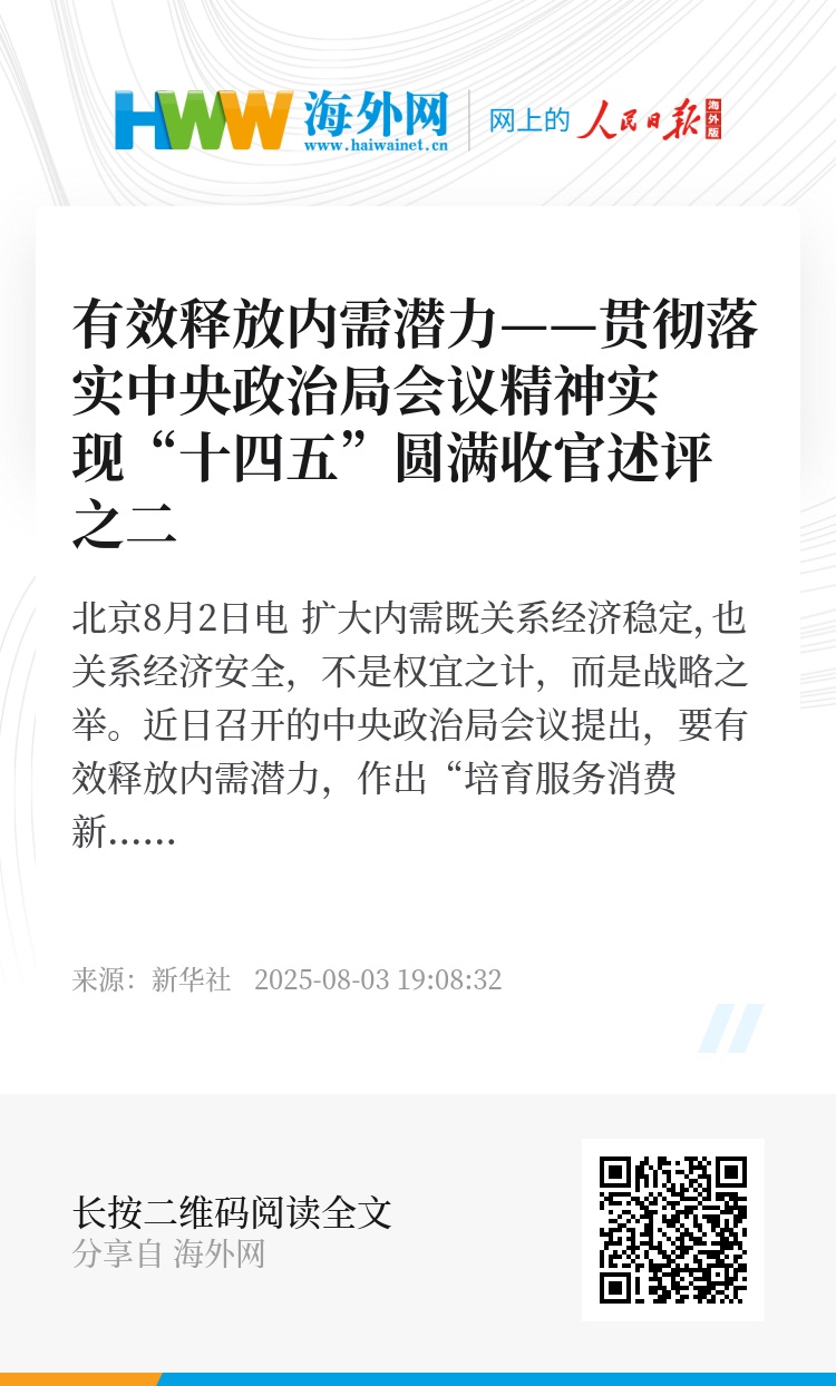 新华社北京8月2日电 扩大内需既关系经济稳定,也关系经济安全,不是权宜之计,而是战略之举。