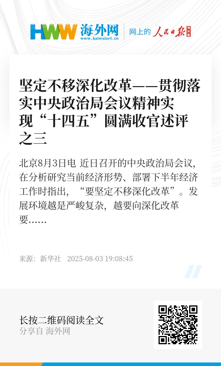 新华社北京8月3日电 近日召开的中央政治局会议,在分析研究当前经济形势、部署下半年经济工作时指出,“要坚定不移深化改革”。