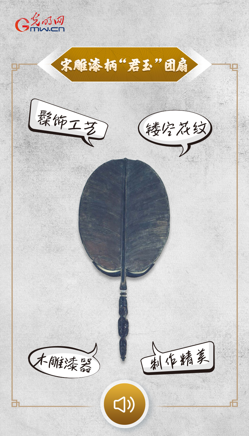 “约八百年前的南宋时期,面对炎炎夏日的气候,一把扇子绝对是避暑纳凉首选。而我作为当年文人墨客手中精雕细琢的团扇,黑漆扇柄采用脱胎和剔犀两种髹饰工艺制成,透雕对称的三组云头如意纹饰。每一处细致的刻画无不表现出精湛的工艺,也透露出我的主人风雅的审美。”