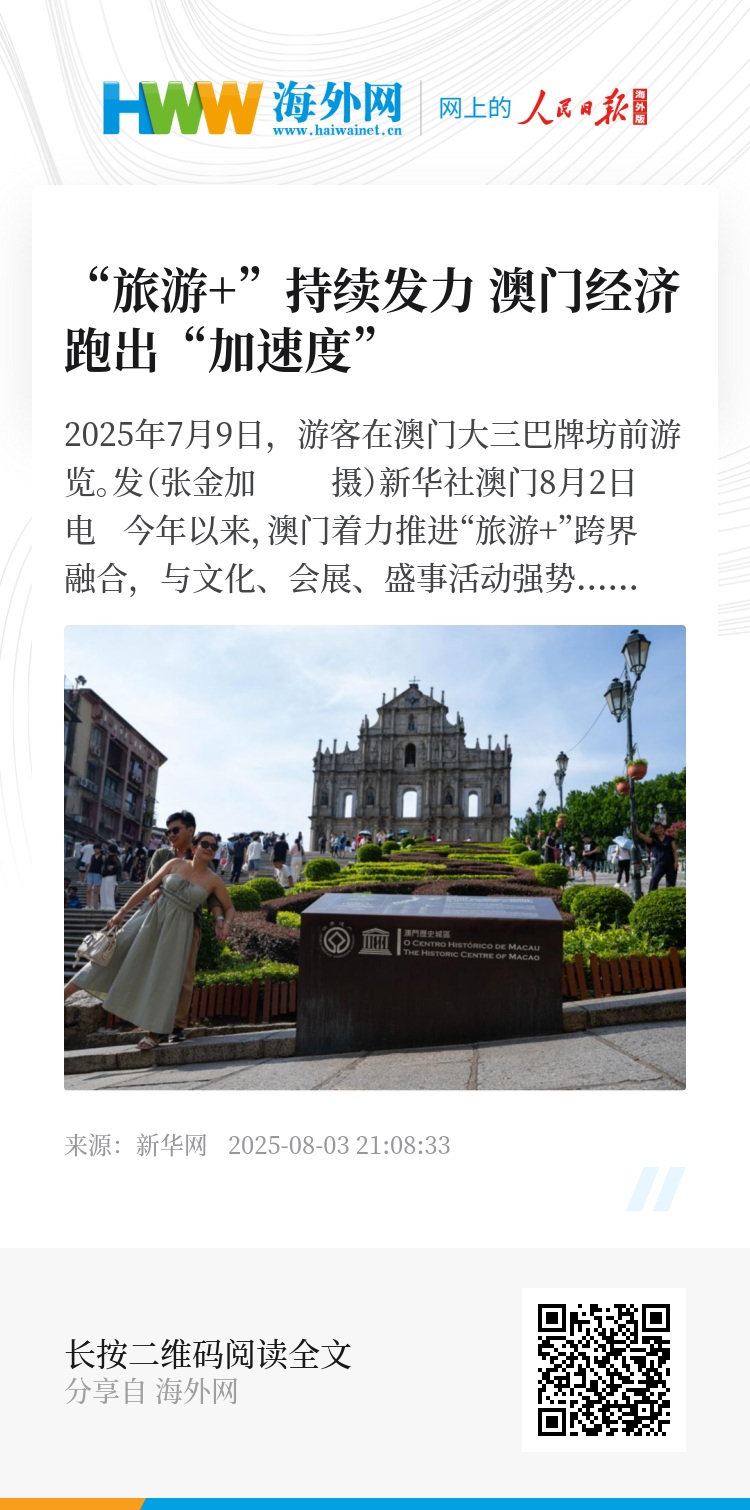 新华社澳门8月2日电 今年以来,澳门着力推进“旅游+”跨界融合,与文化、会展、盛事活动强势携手,助澳门经济跑出“加速度”。