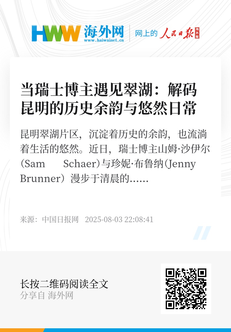昆明翠湖片区,沉淀着历史的余韵,也流淌着生活的悠然。近日,瑞士博主山姆·沙伊尔(Sam Schaer)与珍妮·布鲁纳(Jenny Brunner)漫步于清晨的翠湖,在昆明历史文化讲述者岳立的引领下,聆听老昆明的人文故事,用镜头捕捉云南最松弛的模样。当异乡视角邂逅老城故事,他们能读懂翠湖多少未说的秘密?镜头里的悠然日常,又藏着云南怎样的独特魅力?