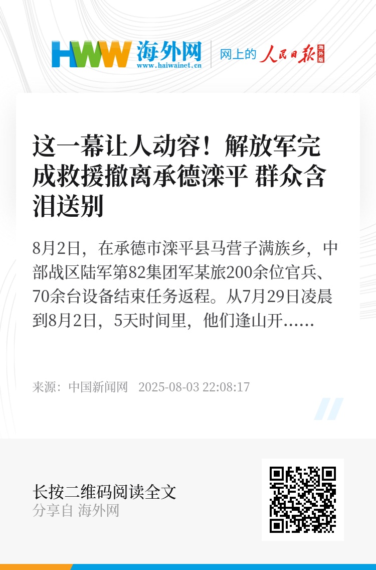 8月2日,在承德市滦平县马营子满族乡,中部战区陆军第82集团军某旅200余位官兵、70余台设备结束任务返程。从7月29日凌晨到8月2日,5天时间里,他们逢山开道、遇水架桥,圆满完成了抢险救灾任务,当地群众夹道送别这群最可爱的人。