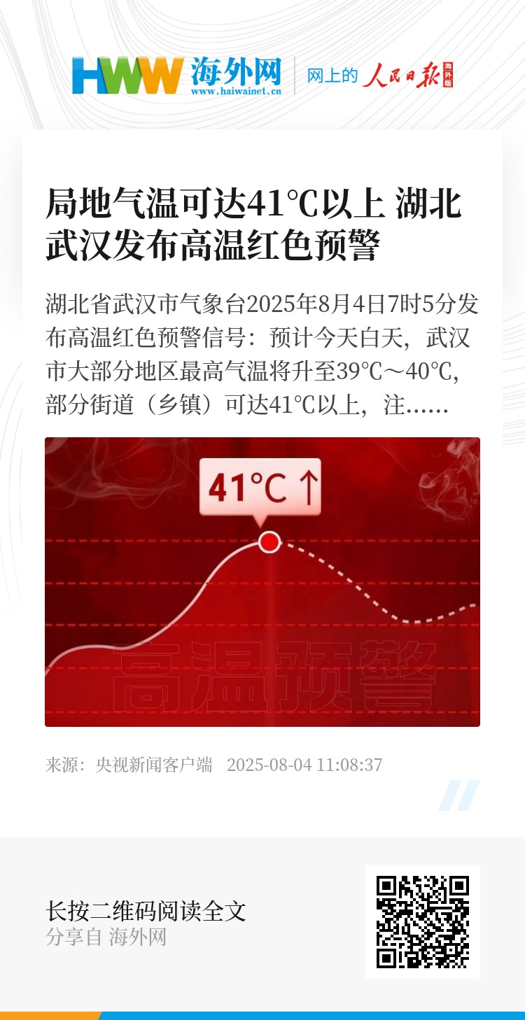 湖北省武汉市气象台2025年8月4日7时5分发布高温红色预警信号:预计今天白天,武汉市大部分地区最高气温将升至39℃~40℃,部分街道(乡镇)可达41℃以上,注意加强防范。