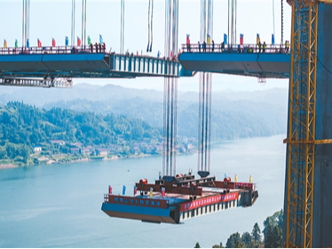 8月3日,由湖南路桥建设集团承建的张官高速控制性工程洞庭溪沅水特大桥主桥顺利合龙,为2026年全线通车奠定坚实基础。张官高速公路北起张家界市永定区,南至怀化市沅陵县官庄镇,是国家高速公路网呼和浩特—北海高速公路的重要组成部分。图为大桥施工现场,一块钢混结合梁在被缓缓提升。