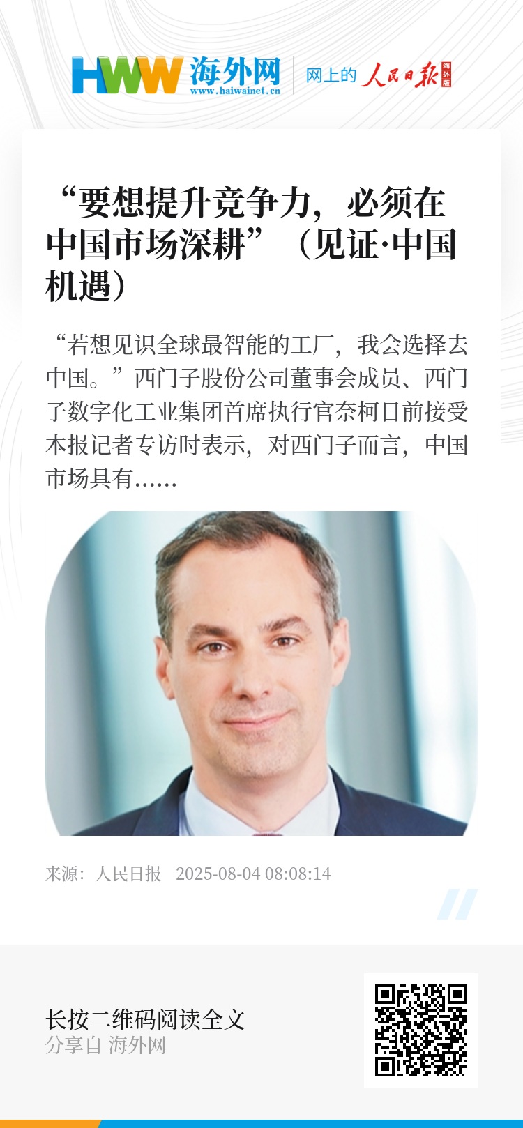 “中国市场长期向好的趋势没有变。”奈柯对中国市场的前景充满信心。他表示,未来,西门子将继续立足中国市场需求,融合数字化能力与全球智慧,以中国速度加快本土创新,助力客户提升竞争力、实现高价值增长。