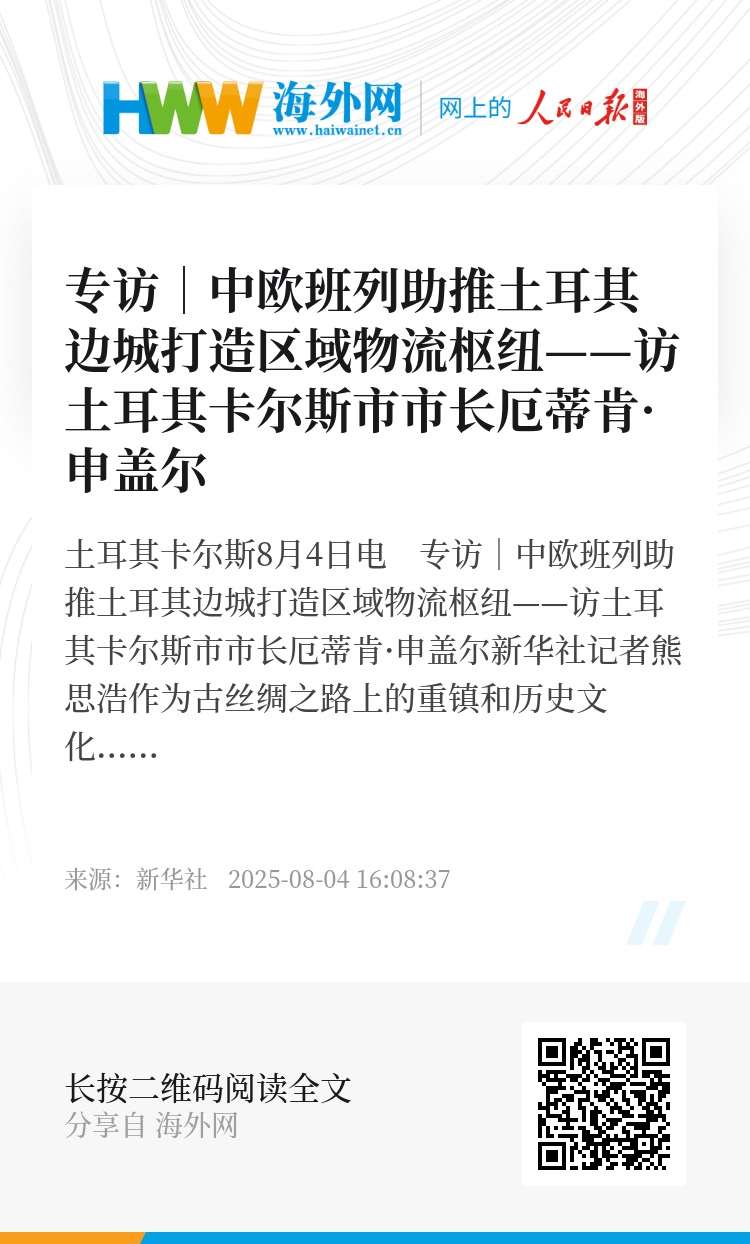 新华社土耳其卡尔斯8月4日电 专访|中欧班列助推土耳其边城打造区域物流枢纽——访土耳其卡尔斯市市长厄蒂肯·申盖尔