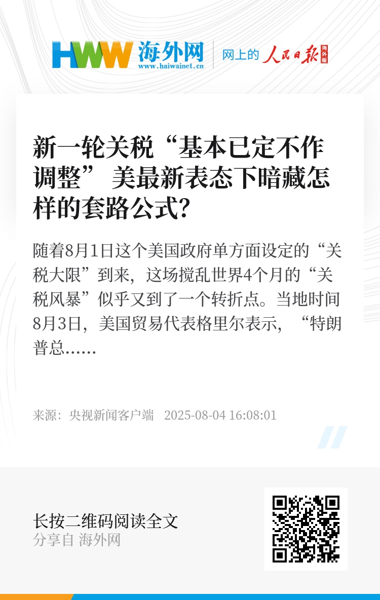 随着8月1日这个美国政府单方面设定的“关税大限”到来,这场搅乱世界4个月的“关税风暴”似乎又到了一个转折点。当地时间8月3日,美国贸易代表格里尔表示,“特朗普总统上周对多国加征的新一轮关税‘基本已定’,不会在当前谈判中作出调整。”