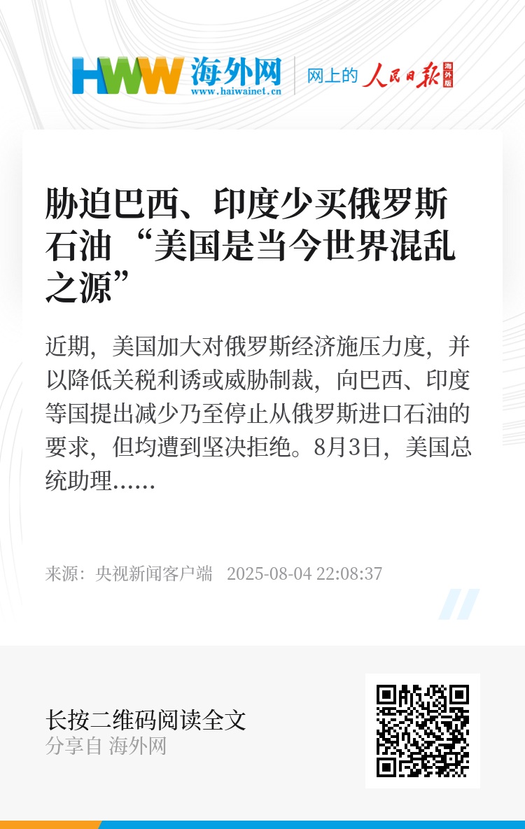 近期,美国加大对俄罗斯经济施压力度,并以降低关税利诱或威胁制裁,向巴西、印度等国提出减少乃至停止从俄罗斯进口石油的要求,但均遭到坚决拒绝。
