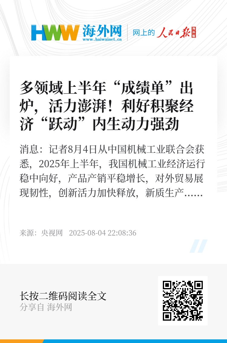 央视网消息:记者8月4日从中国机械工业联合会获悉,2025年上半年,我国机械工业经济运行稳中向好,产品产销平稳增长,对外贸易展现韧性,创新活力加快释放,新质生产力积极发展,产业升级和高质量发展成效显著。