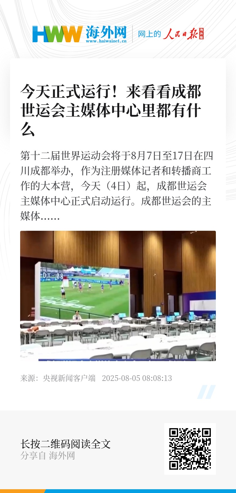 第十二届世界运动会将于8月7日至17日在四川成都举办,作为注册媒体记者和转播商工作的大本营,今天(4日)起,成都世运会主媒体中心正式启动运行。